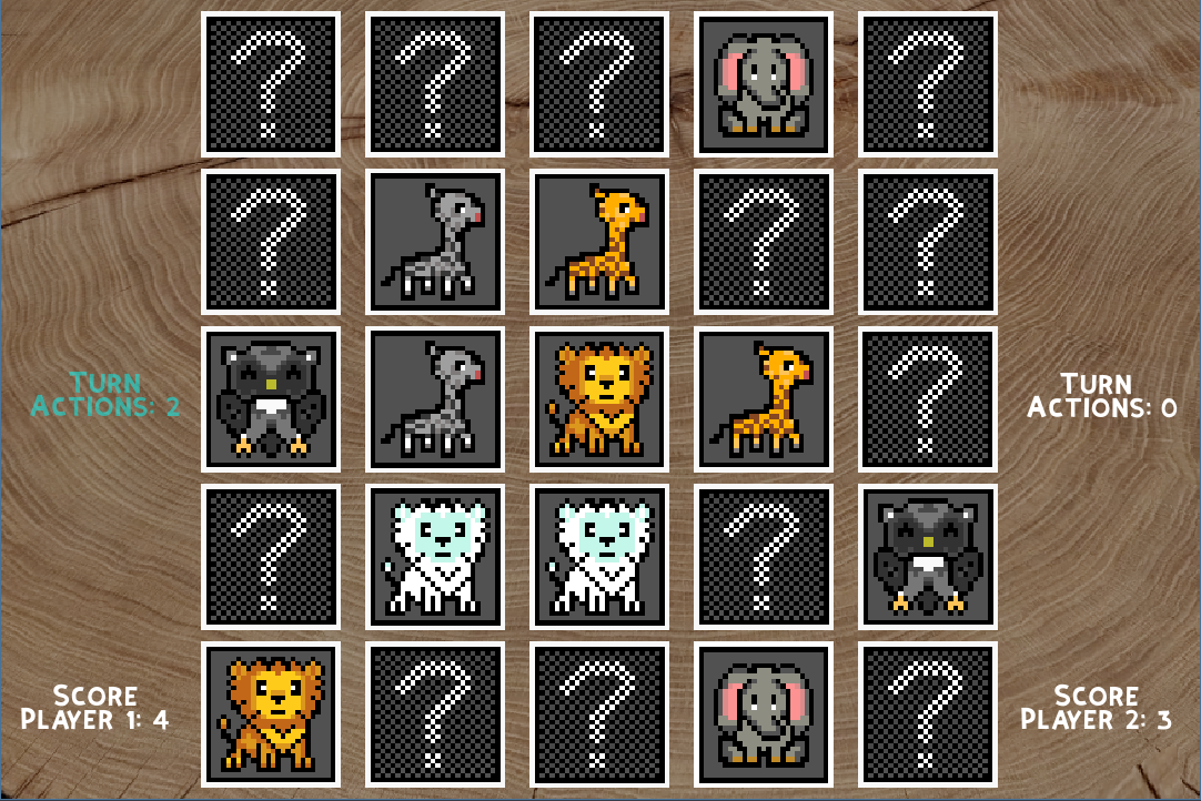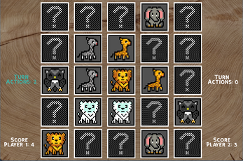 Take turns flipping cards to find matching animal pairs. Every pair found earns points and a bonus turn, with a chance to score double if you pair again!